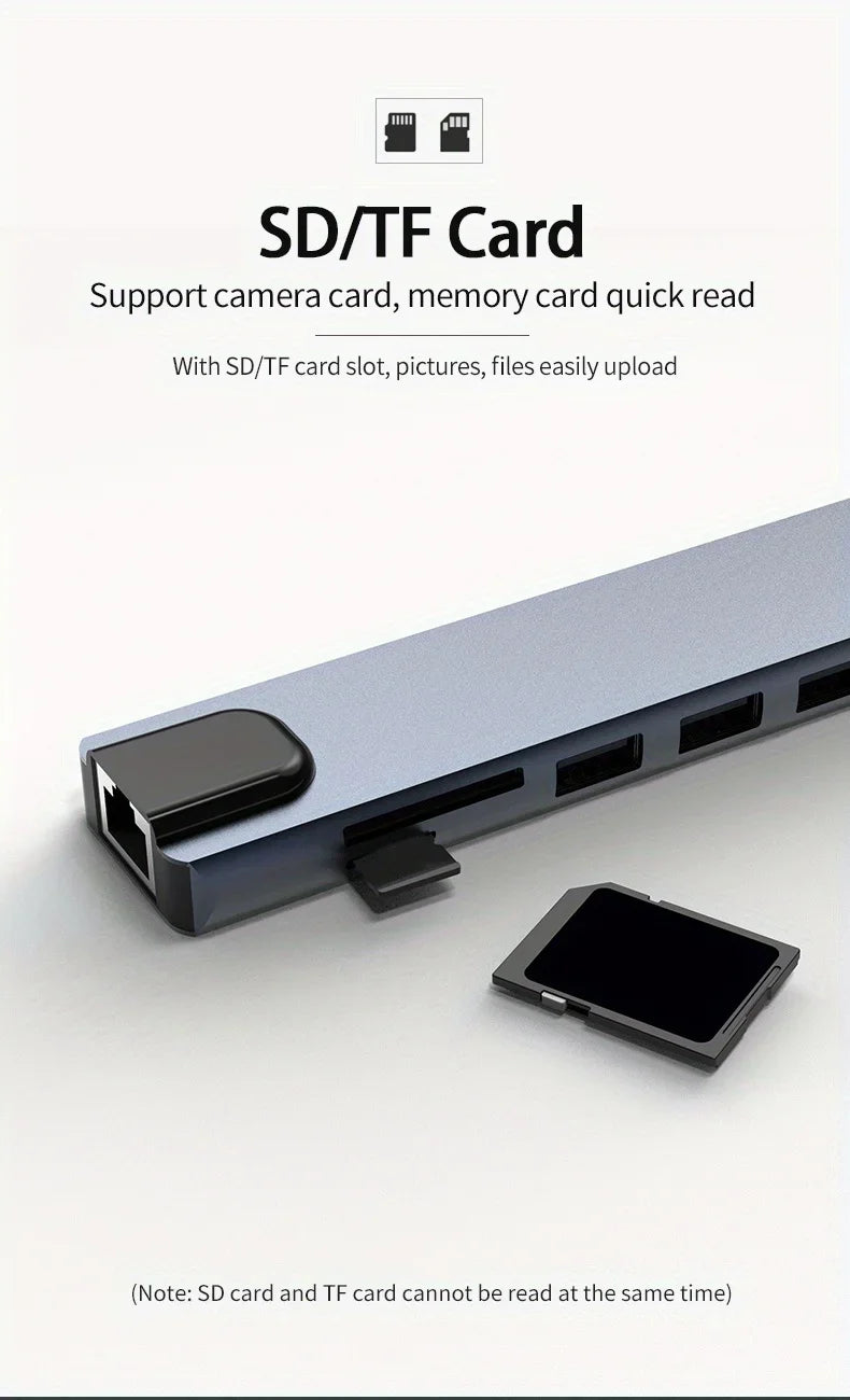 4. Supported functions: The splitter extended display supports PD (Power Delivery) functionality that can provide up to 100W of power output. It also comes equipped with an RJ45 Ethernet port for wired network connectivity. Additionally, it supports reading of SD and TF storage cards.