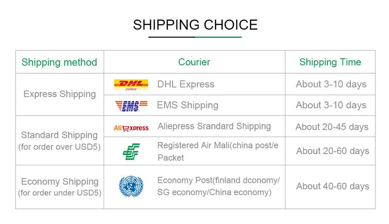 A: The time of receiving the package is determined according to your country and the selected logistics. If you choose economic logistics, it is generally about 60 days. If you choose registered logistics, it is about 30-60 days. The fastest 15 -30 days.