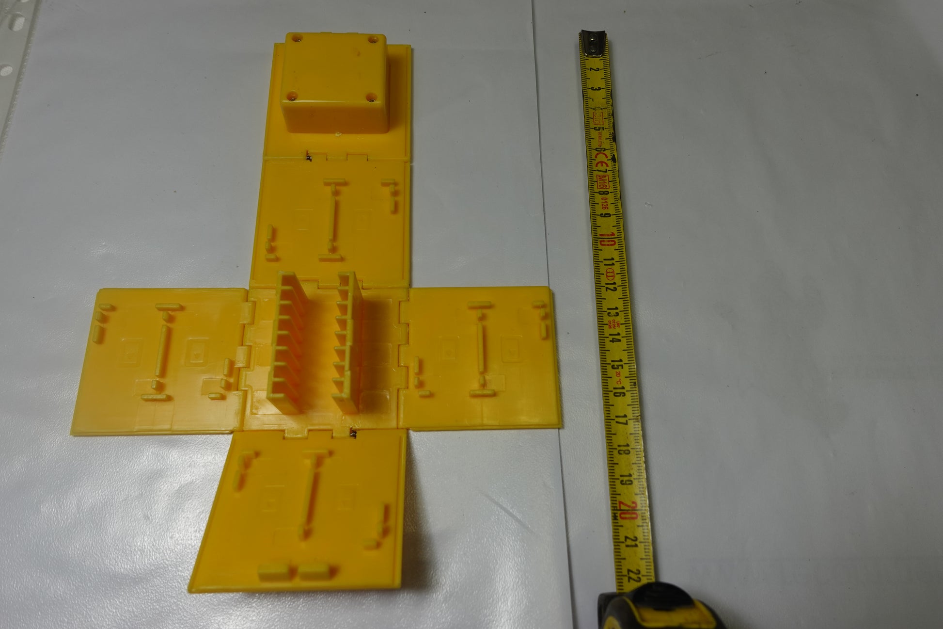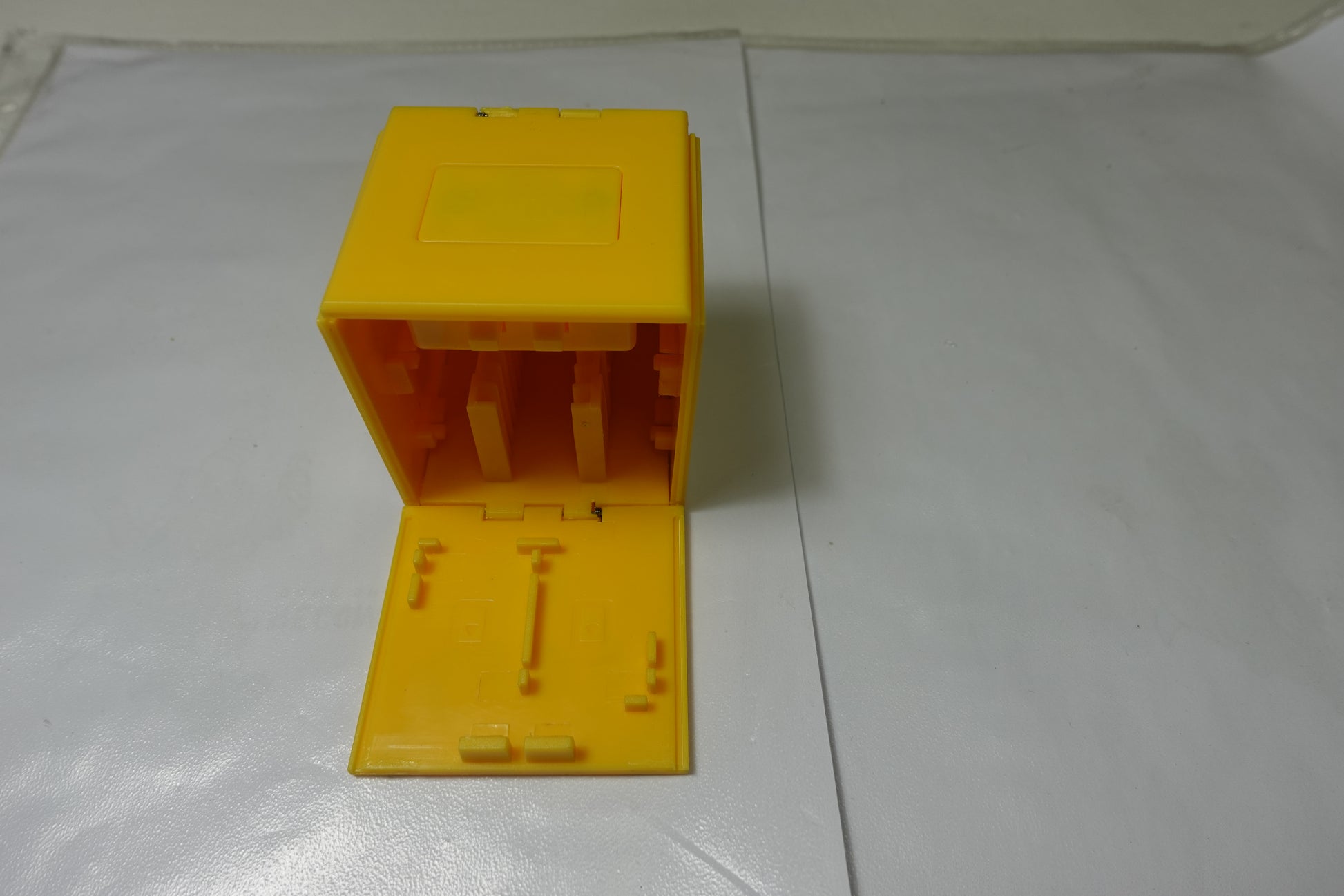 Design Iconico: Forma cubica classica in giallo acceso con il simbolo del punto interrogativo in rilievo su tutti i lati.