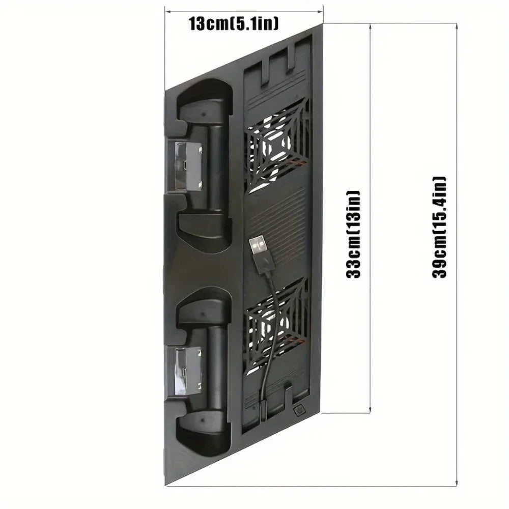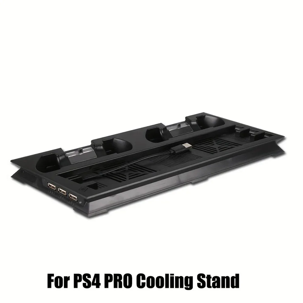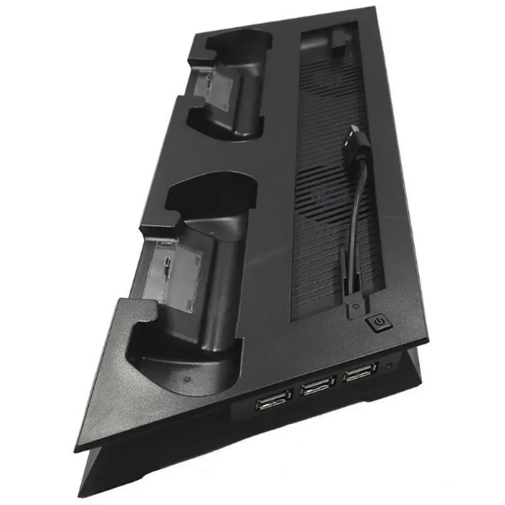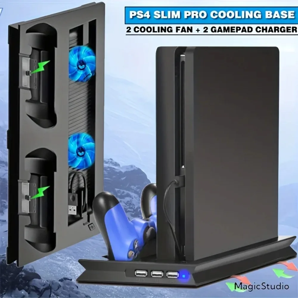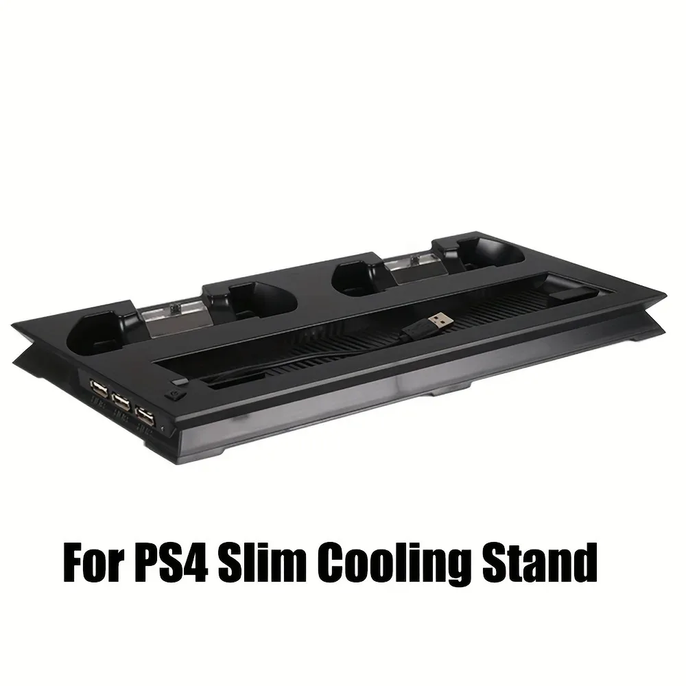 Playstation 4 Slim/PRO console stand + cooling fan + charging station + USB HUB Space saving vertical stand: Space saving that allows PS4 Slim console to be used safely in a vertical position. Dual cooling fans: Keep your Playstation 4 Slim cool with the vertical cooling stand.