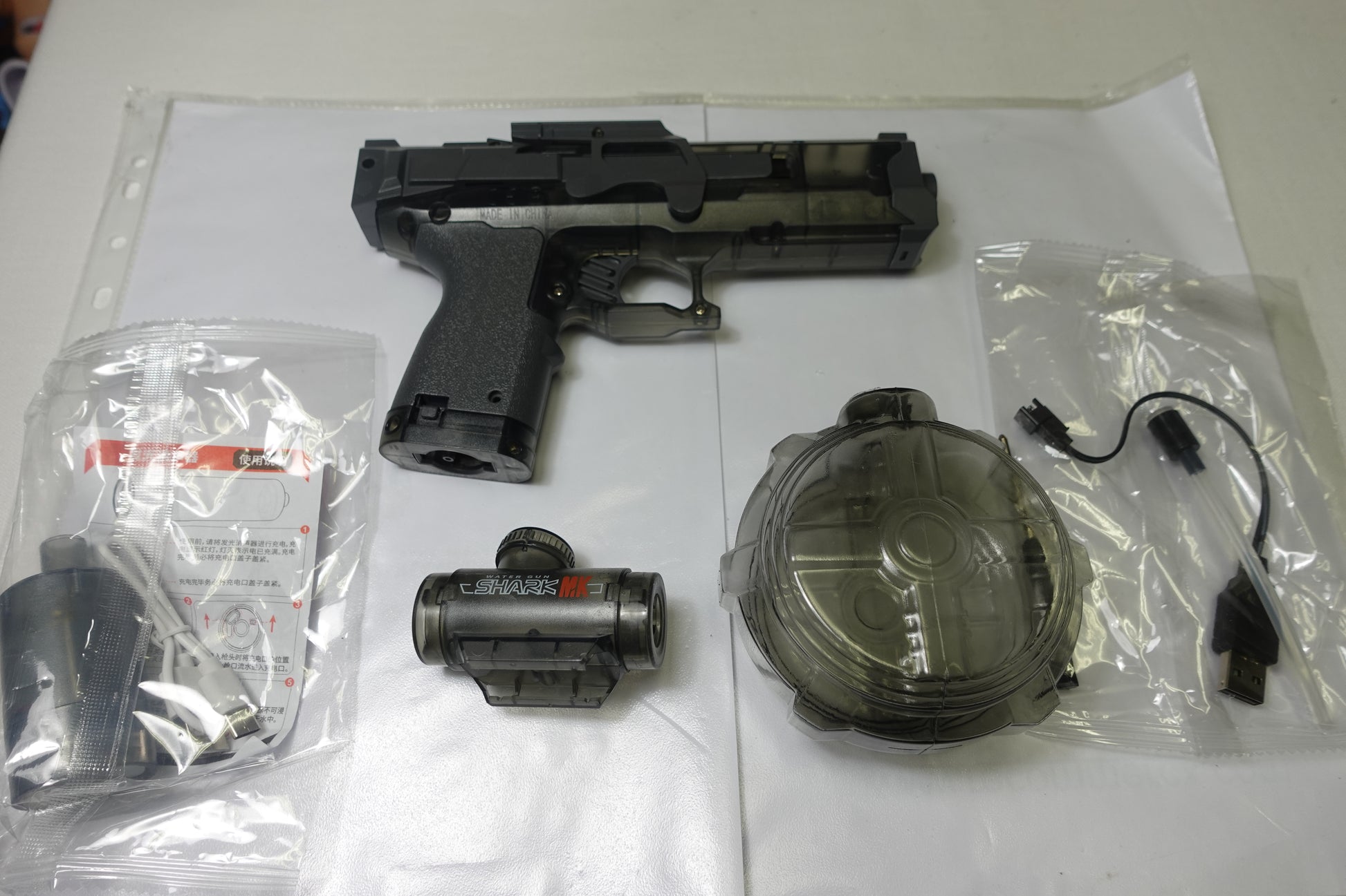 📦 Contenuto: Pistola, batteria ricaricabile, cavo di ricarica USB e caricatore/serbatoio.