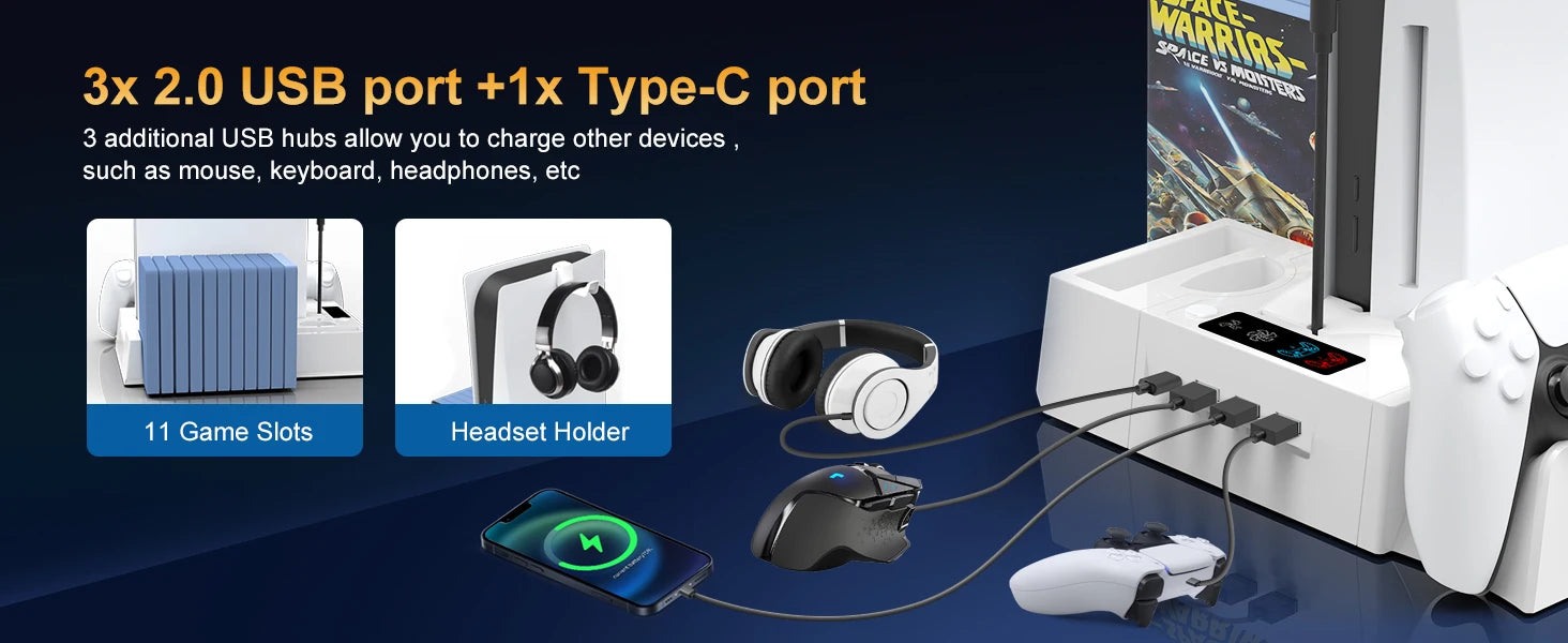 · 【Cooling Fan forPS5 Slim and PS5 Digital/Disc Edition】 The ps5 slim stand with efficient cooling fans and ps5 controller charger station, headset holder, 11 ps5 game slots , 3 extra USB charging ports, screw storage and a ps5 remote storage. This ps5 cooling station can quickly charge two ps5 at the same time, and dissipate heat for ps5 console.